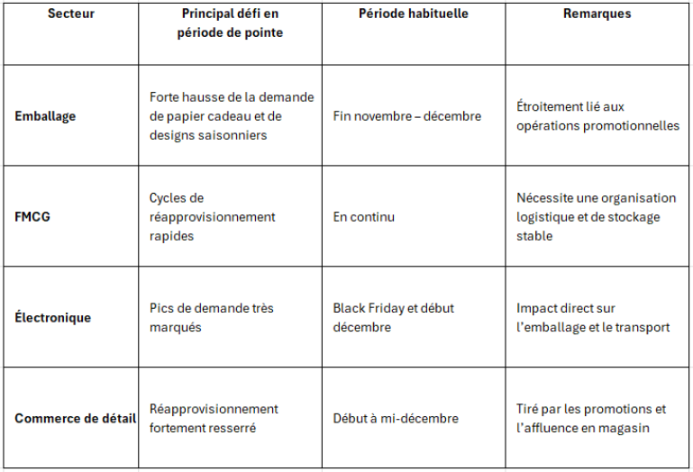 Le secteur de l’emballage connaît une forte hausse de la demande de papier cadeau et de designs saisonniers de fin novembre à décembre, tandis que l’électronique enregistre des pics marqués autour du Black Friday et au début du mois de décembre.