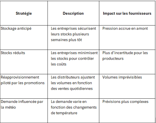 Le tableau ci-dessous montre comment les différents comportements de gestion des stocks pendant les fêtes impactent les fournisseurs à chaque étape de la chaîne de valeur.