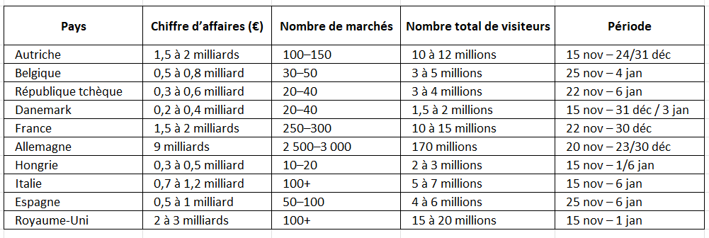 Ce tableau met en évidence les différences entre les marchés de Noël en Europe et permet aux fournisseurs d’anticiper les volumes, d’organiser les livraisons et de préparer leurs demandes de devis pour la période de pointe.
